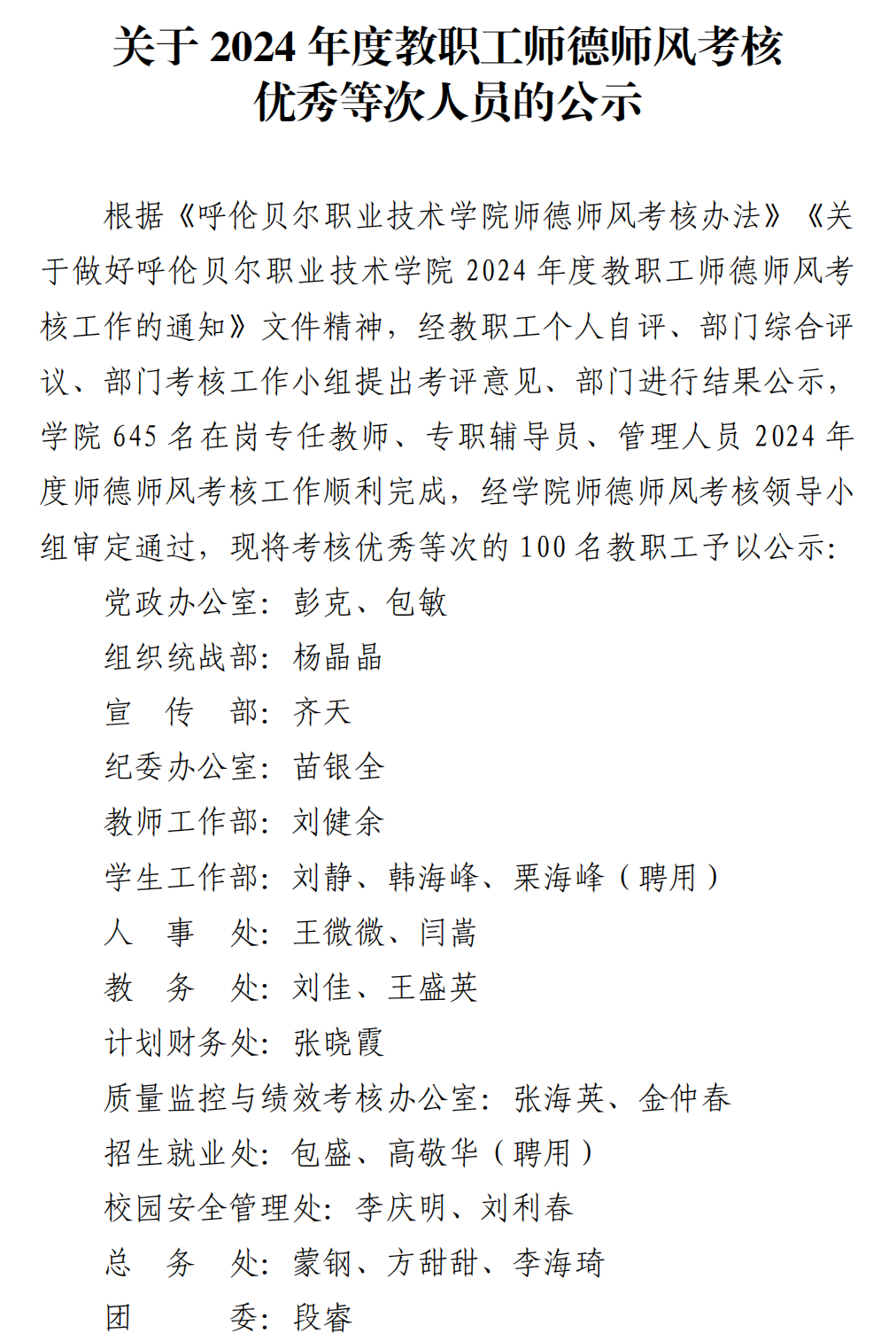 关于2024年度教职工师德师风考核优秀等次人员的公示